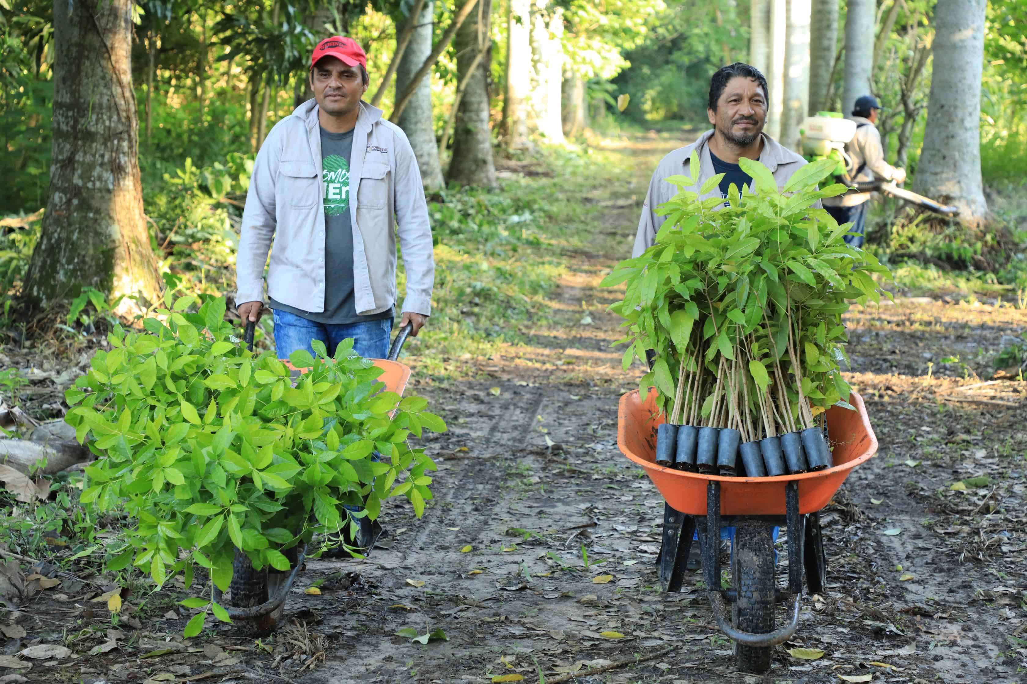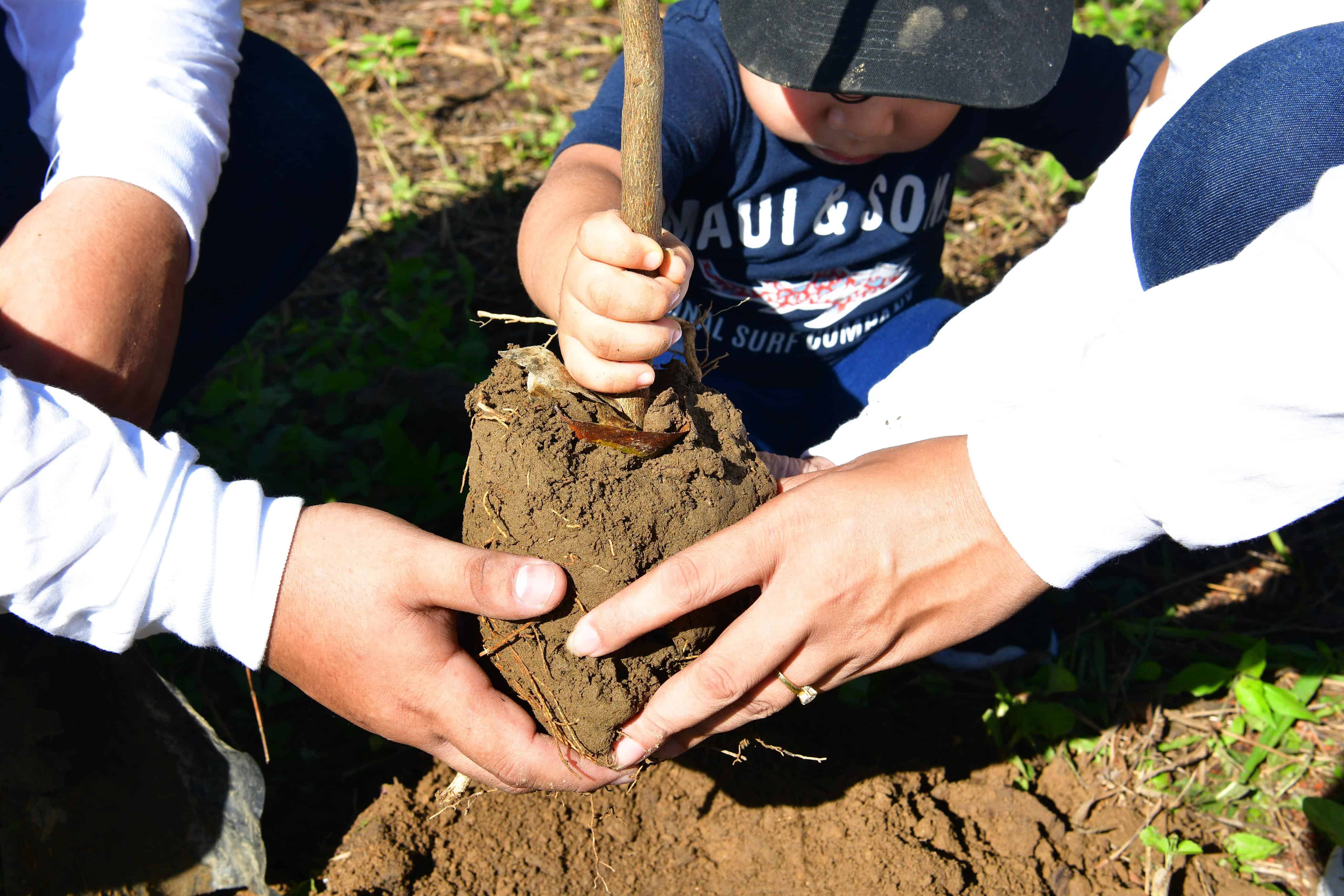 Mientras juntos plantan una pequeña planta de cacao rodeada de especies frutales que formarán un sistema agroforestal.