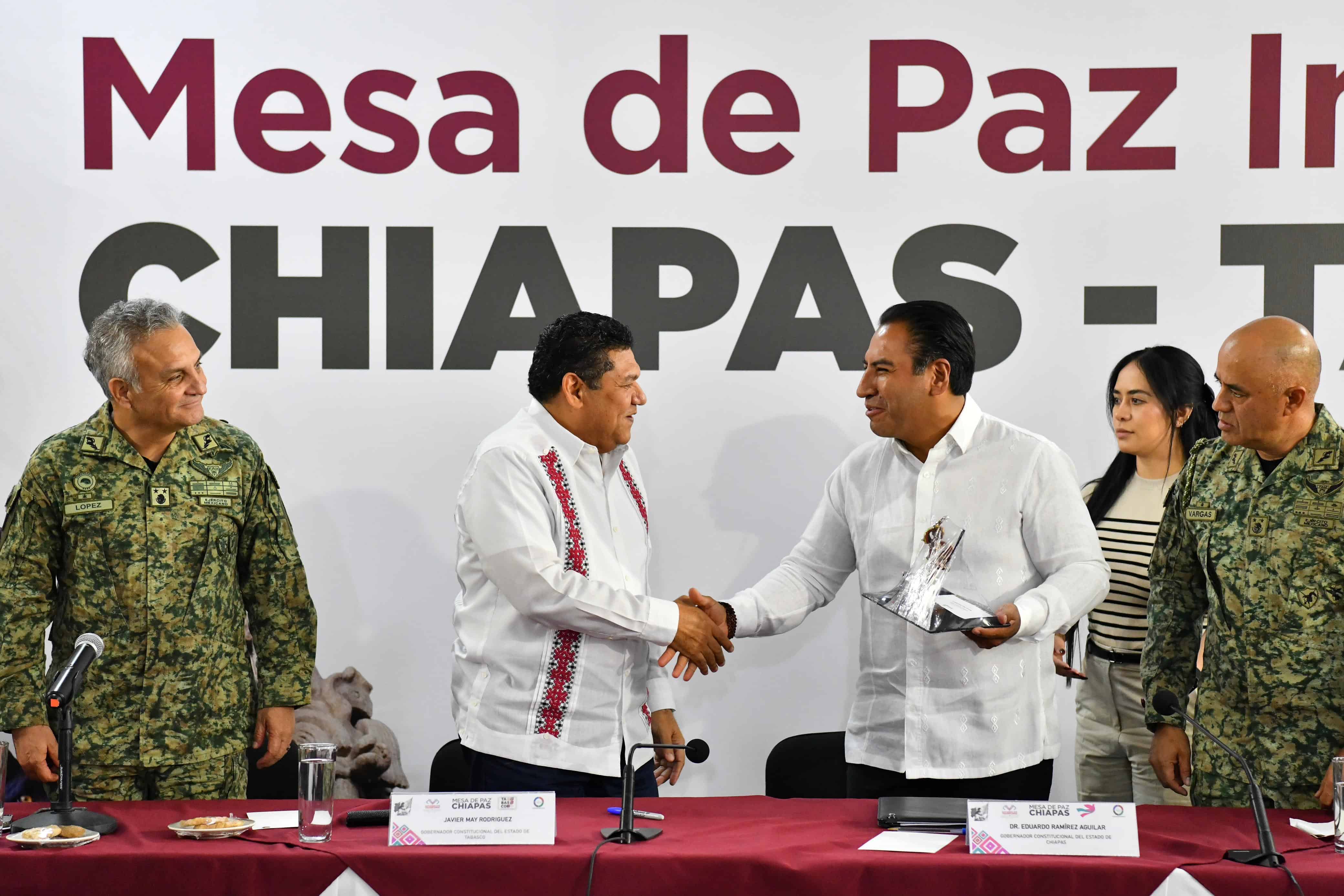 - El documento fue firmado por ambos gobernadores, además de los titulares de la Secretaría de Seguridad y Protección Ciudadana, Serafín Tadeo Lazcano; de la Fiscalía General del Estado, Óscar Tonathiu Vázquez Landeros y del Secretariado Ejecutivo del Sistema Estatal de Seguridad Pública, Francisco Javier Zúñiga Hernández; así como por sus pares de las instituciones homólogas de Chiapas.