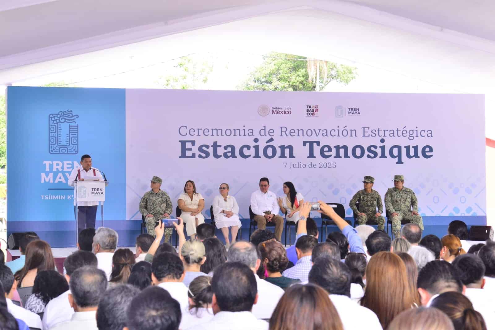 - El mandatario estatal estuvo acompañado en el templete por el general de brigada y director del Tren Maya, Oscar David Lozano Ávila; la titular de la Secretaría de Turismo y Desarrollo Económico, Katia Ornelas Gil y la presidenta del Consejo Coordinador Empresarial de Tabasco (CCET), Dolores Hernández Valencia, además de mandos militares.