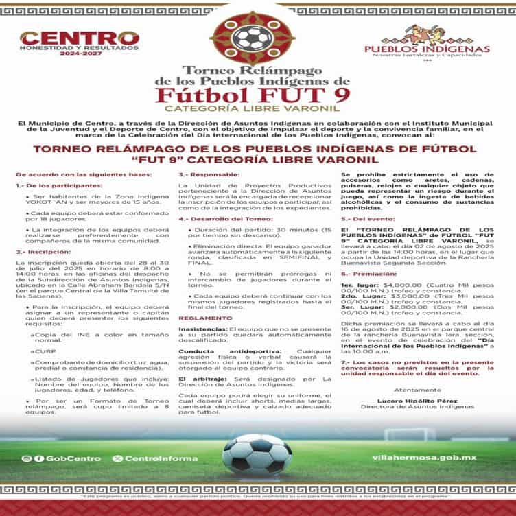 De acuerdo con la convocatoria, el torneo --organizado por medio de la Dirección de Asuntos Indígenas en coordinación con el Instituto Municipal de la Juventud y el Deporte de Centro-- se llevará a cabo el próximo 2 de agosto de 2025 a las 14:00 horas, teniendo como sede la Unidad Deportiva de la ranchería Buenavista Segunda Sección.