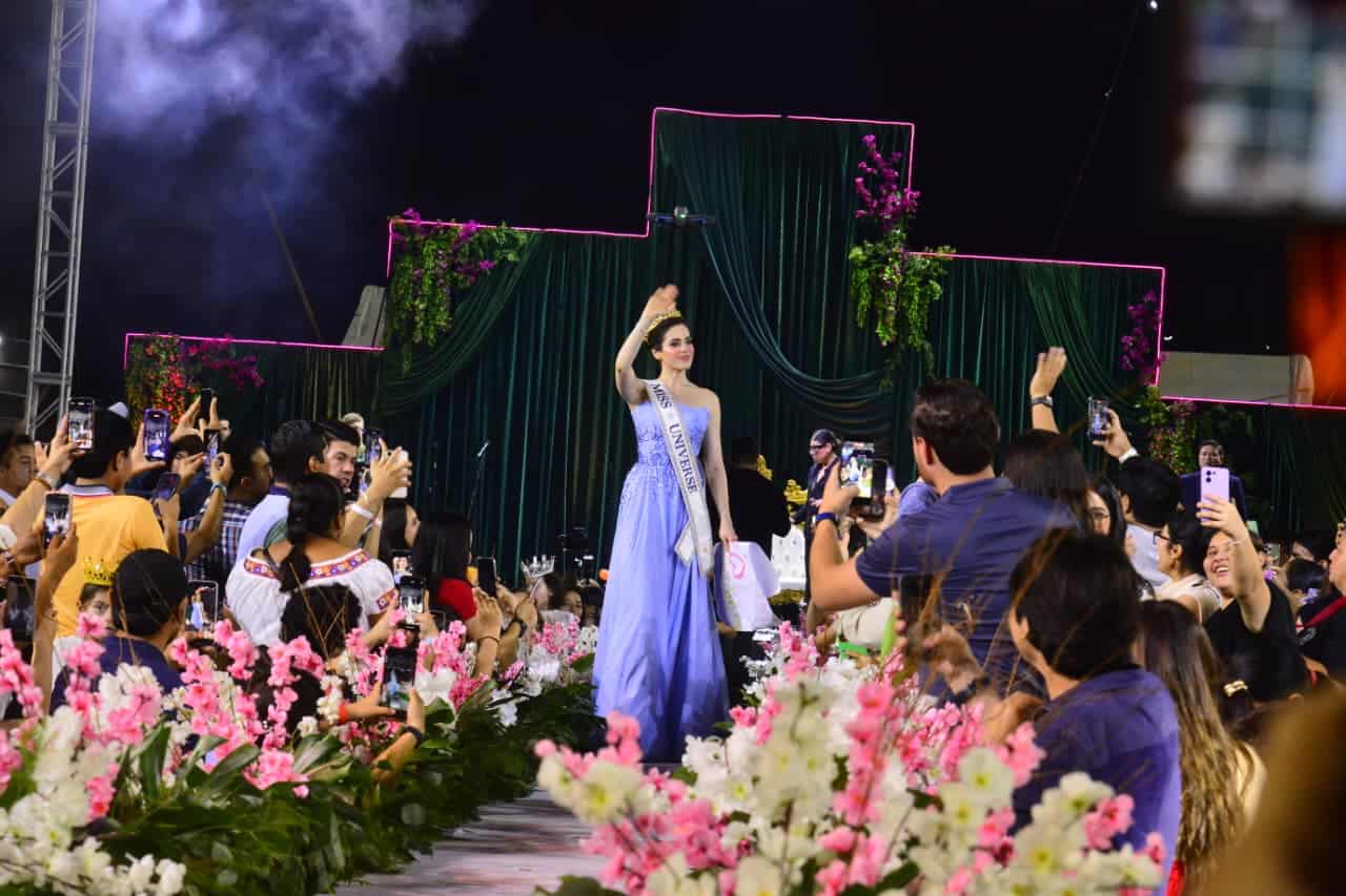 - La secretaria de Turismo y Desarrollo Económico del Estado de Tabasco, Katia Ornelas Gil Pérez, también brindó un mensaje de celebración: "Hoy este estadio no solo recibe a una mujer, recibe a una mujer que le pertenece a Tabasco. Te celebramos por el camino que te trajo aquí; tu triunfo no nació del aplauso fácil, nació de las horas trabajadas". La noche concluyó con un nuevo recorrido de Fátima Bosch por la pasarela.